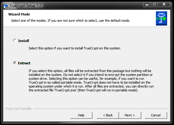 Astfel, ajungem la utilizarea unui program care sa cripteze datele de pe stick, in totalitatea lor, acestea putand fi accesate doar prin introducerea parolei corecte, pe care am asociat-o la criptare. Un program recomandat este TrueCrypt, a ajuns la varianta7.2 si il puteti descarca de aici: http://truecrypt.sourceforge.net/. Dupa descarcare, lansati in executie programul de instalare, acceptati termenii licentei si alegeti una dintre cele doua variante pe care le aveti puse la dispozitie: sa il instalati pe sistemul de pe care veti face criptarea (de ales „Install”) sau sa il utilizati ca un program portabil, caz in care nu se va instala nimic in directorul System al sistemului de operare – optiunea de ales fiind „Extract” (vexzi foto). Indiferent de varianta aleasa, operatiunea e terminata! Puteti trece la criptarea stick-ului sau a altui portabil si la indepartarea stresului provenit de la gandurile negre asociate cu varianta inadmisibila de a ajunge continutul lui in atentia publicului larg! :) .